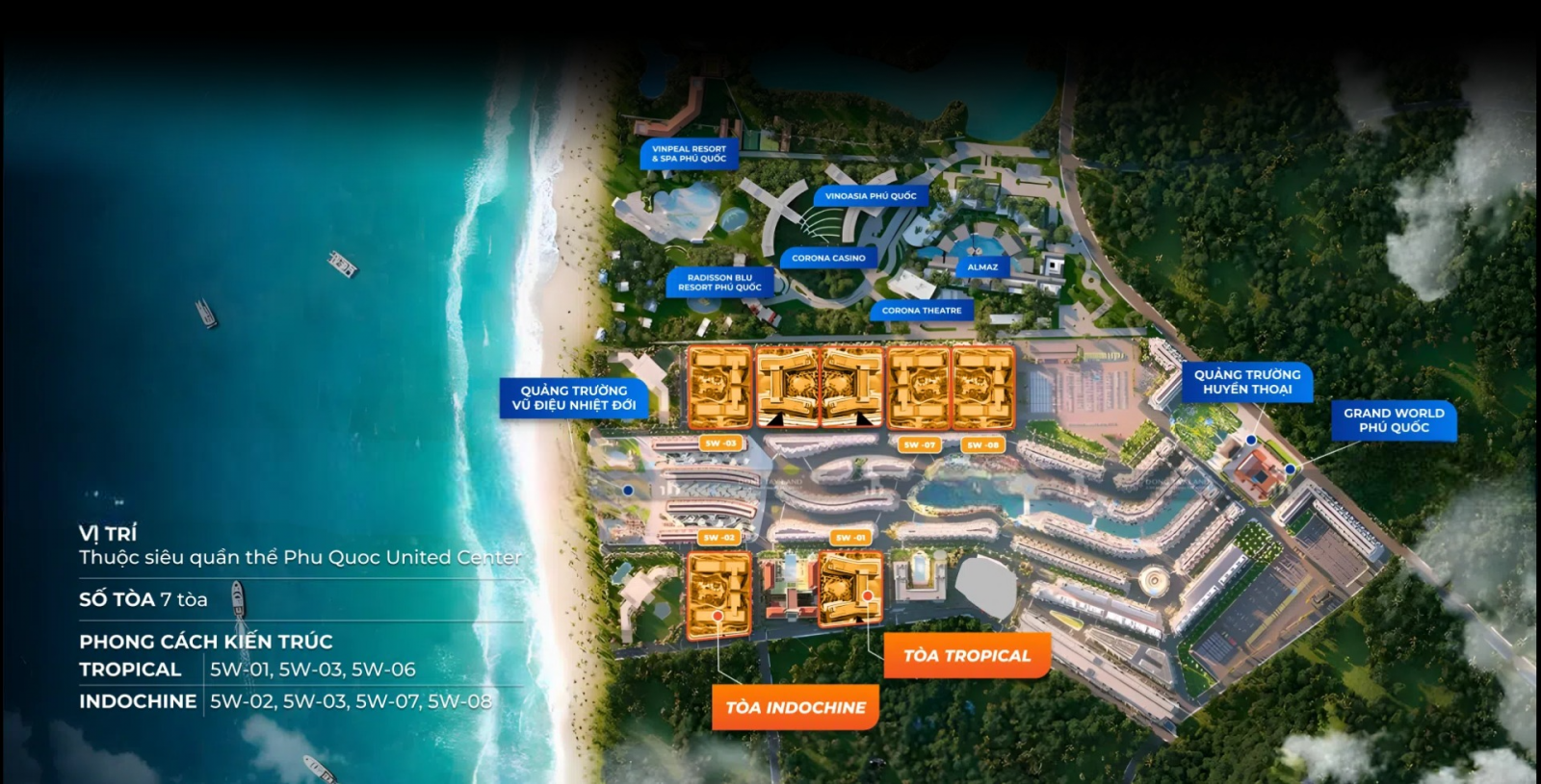 VỊ TRÍ TOÀ INDOCHINE VÀ TROPICAL TRONG QUẦN THỂ GRAND WORLD PHÚ QUỐC